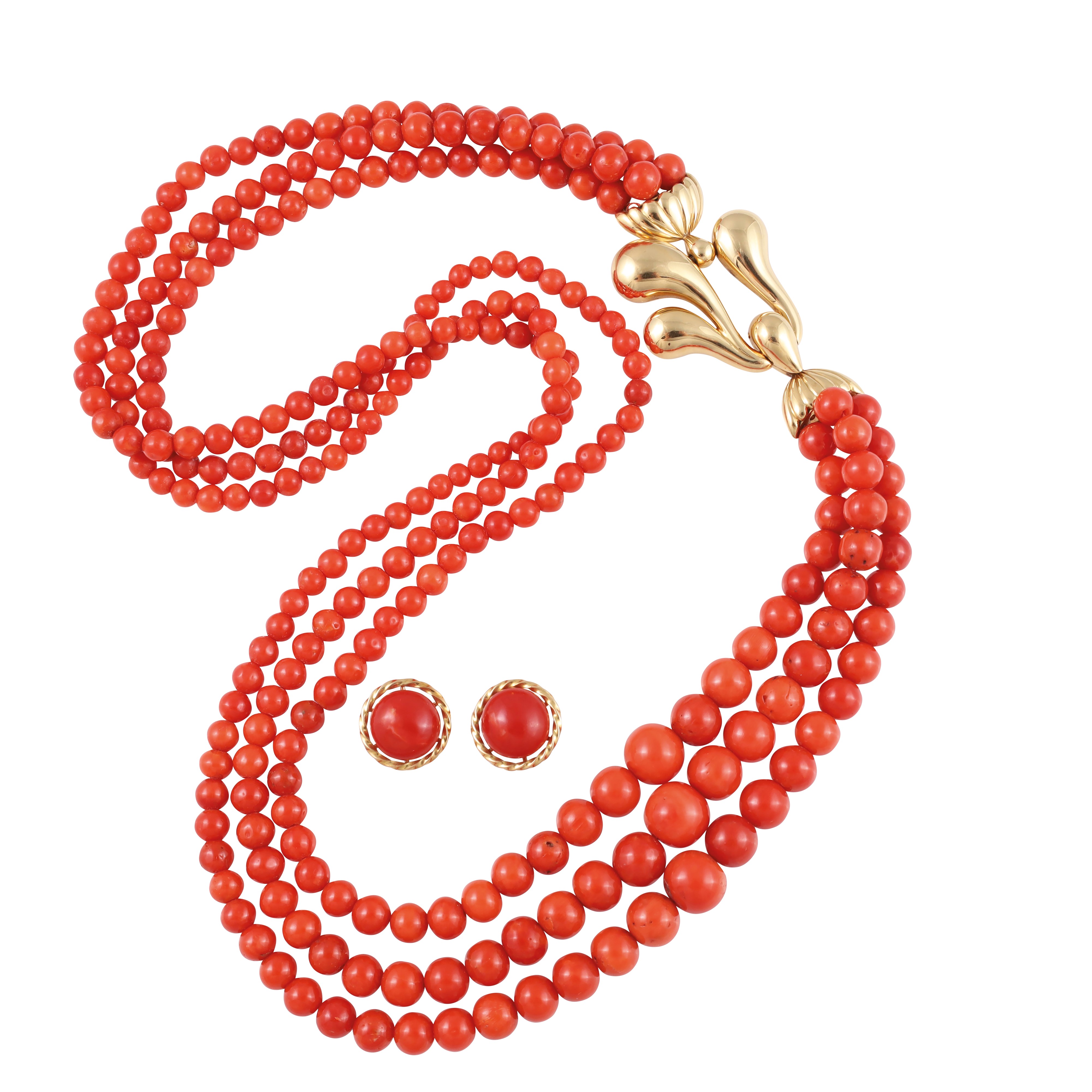 ~ LOT OF CORAL NECKLACE WITH 18KT GOLD CASP AND A PAIR OF 18KT GOLD EARRINGS WITH CORAL
