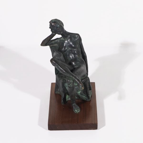 Bronze sculpture of a seated woman (17.3 cm) with wooden base