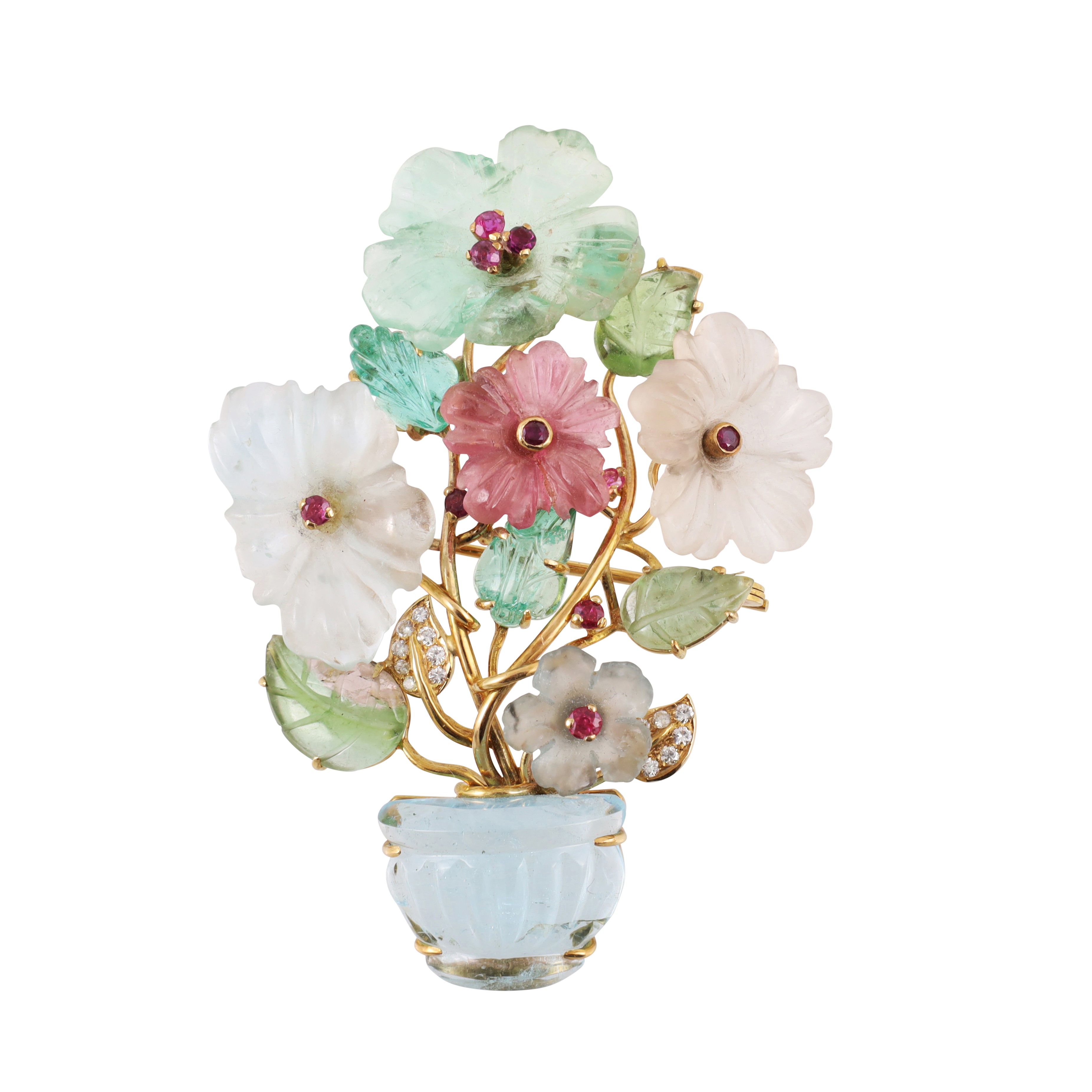 18KT GOLD BROOCH WITH DIAMONDS, RUBIES AND GEMSTONES (slight chip)