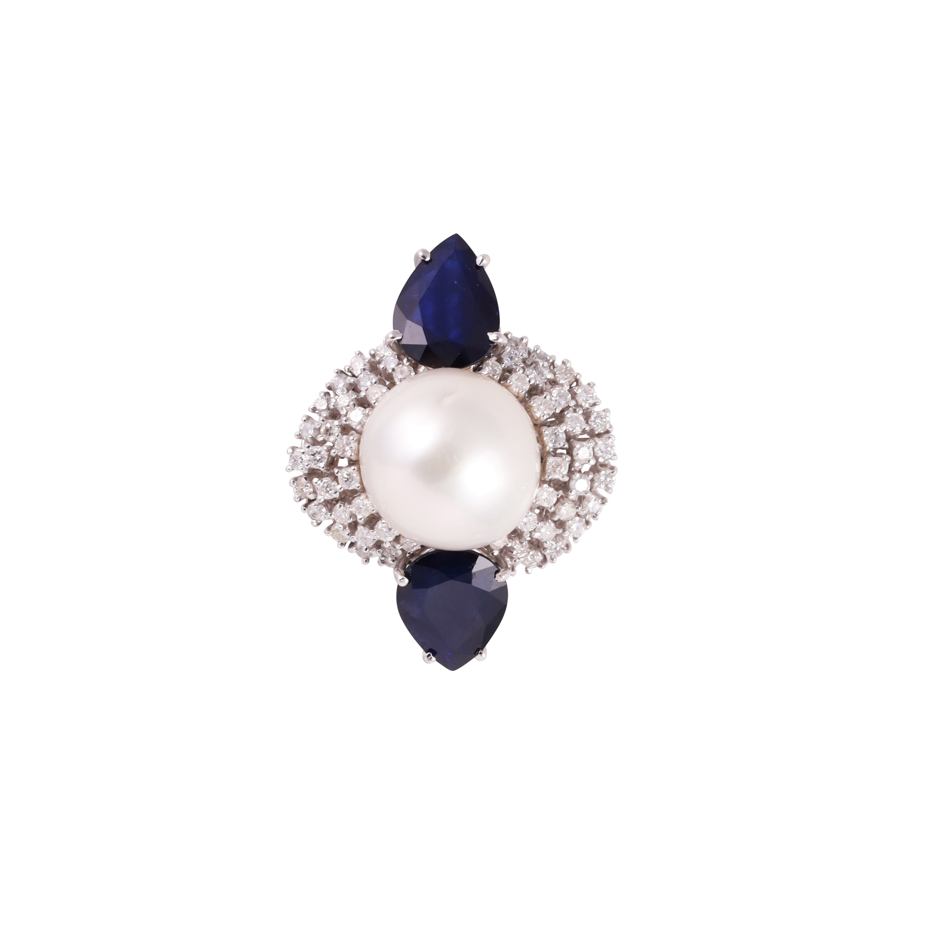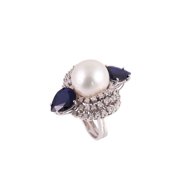 18KT GOLD RING WITH CULTURED PEARL, DIAMONDS AND SAPPHIRES