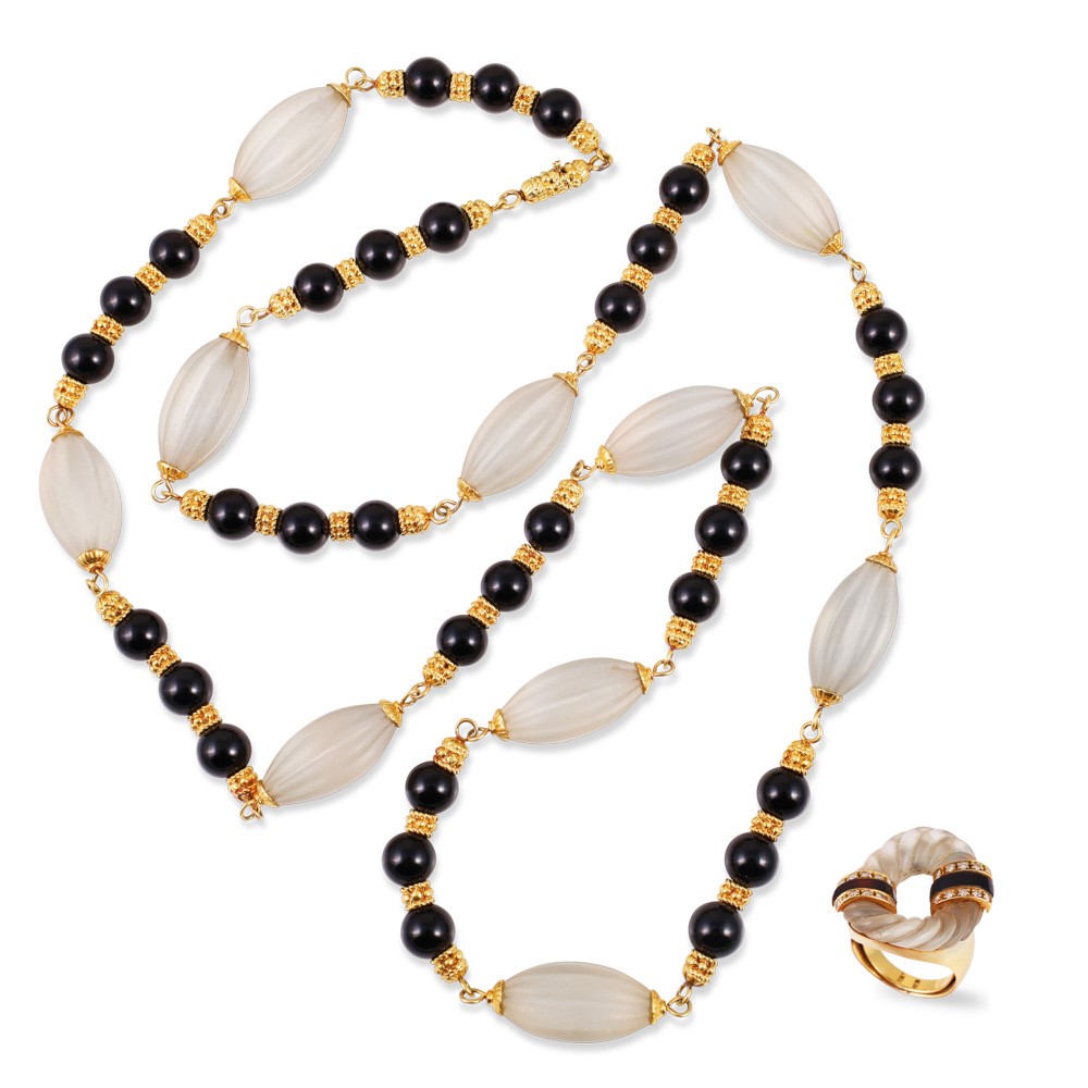 18KT GOLD NECKLACE AND RING SET WITH QUARTZ, ONYX AND DIAMONDS
