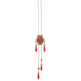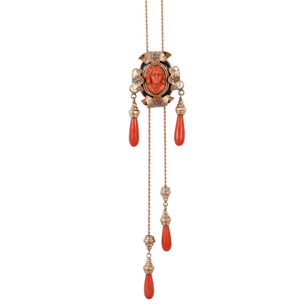 ~ 9KT GOLD AND SILVER NECKLACE, UPS AND DOWNS CENTRAL SET WITH CORAL, ONYX AND ROSE CUT DIAMONDS
