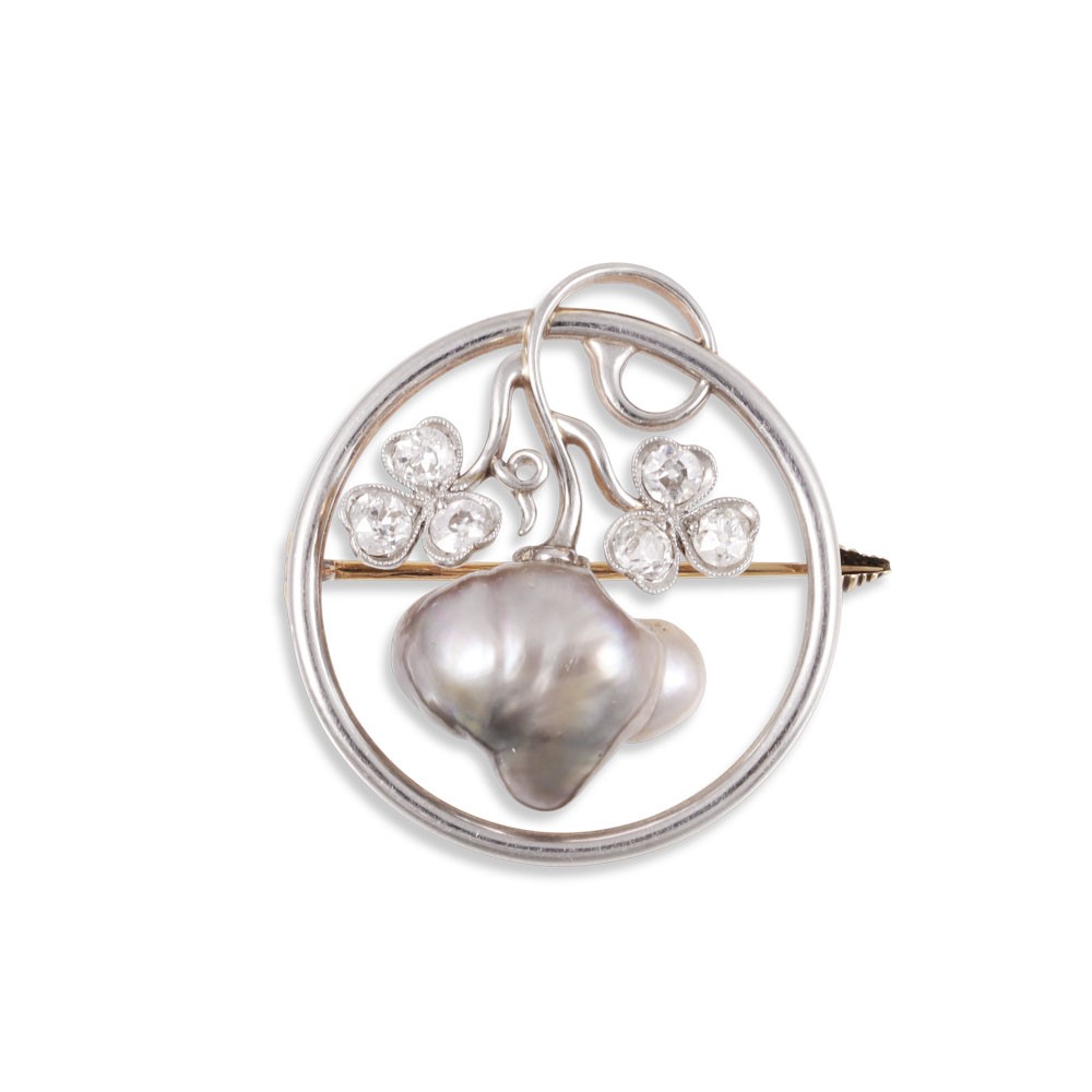 PLATINUM AND 18KT GOLD BROOCH SET WITH OLD EUROPEAN CUT DIAMONDS AND BAROQUE CULTURED PEARL