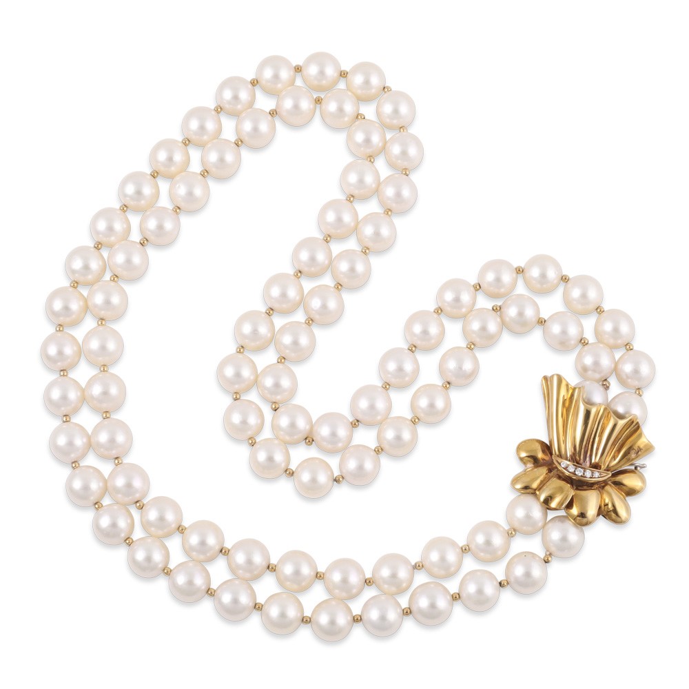 TWO-STRAND CULTURED PEARL NECKLACE WITH 18KT GOLD DIAMOND-SET CLASP